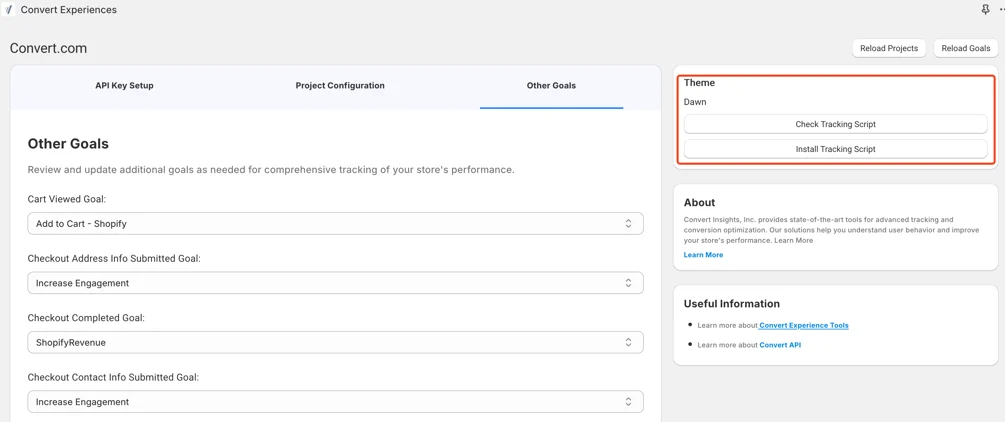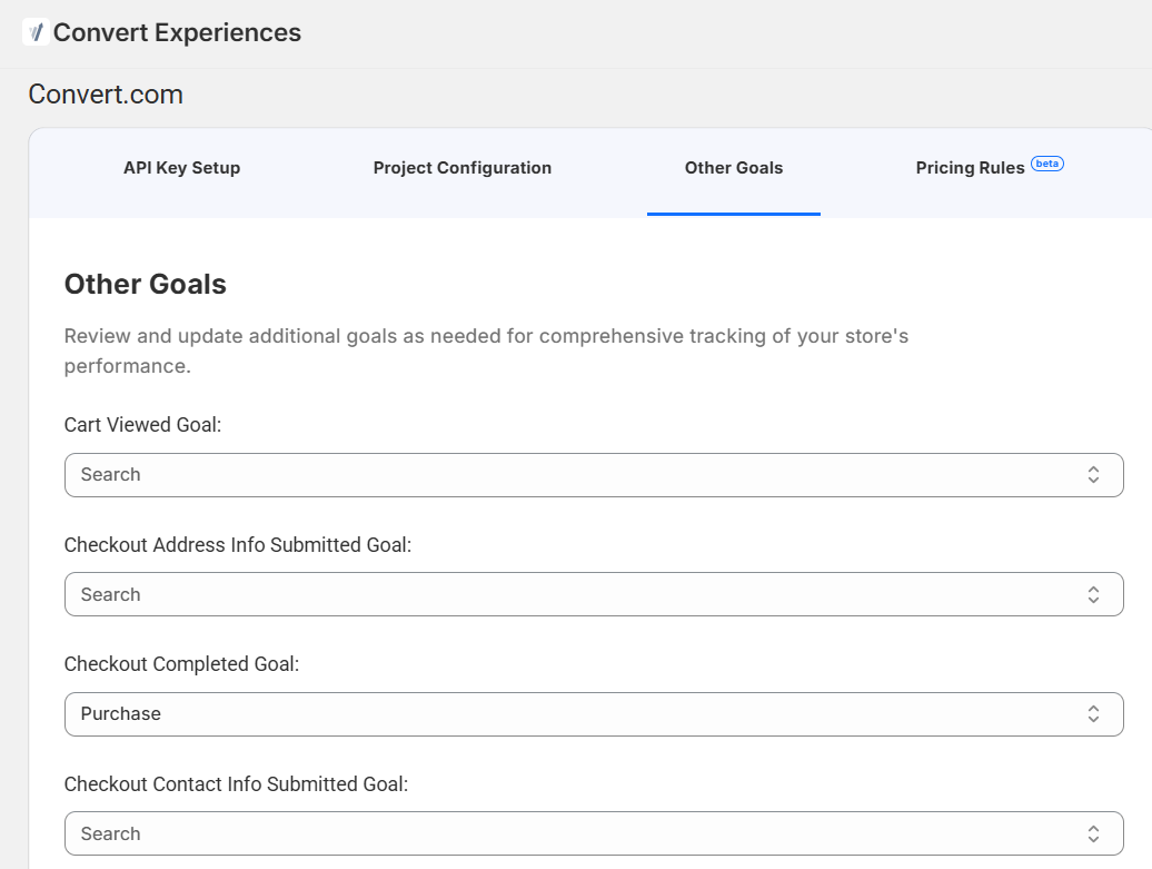 The Convert Shopify app pulls goals directly from your Convert project. These goals must exist before you configure the app.